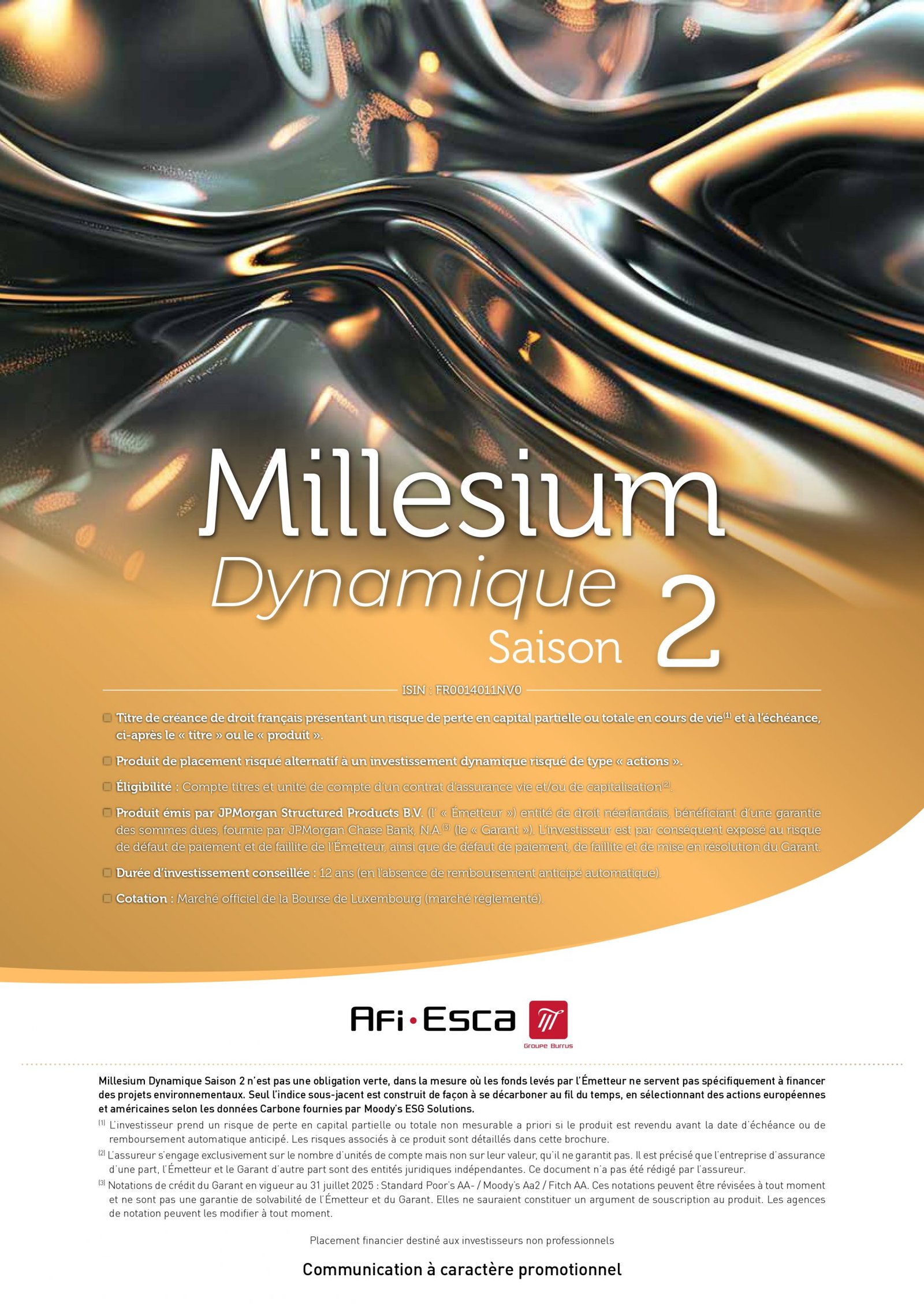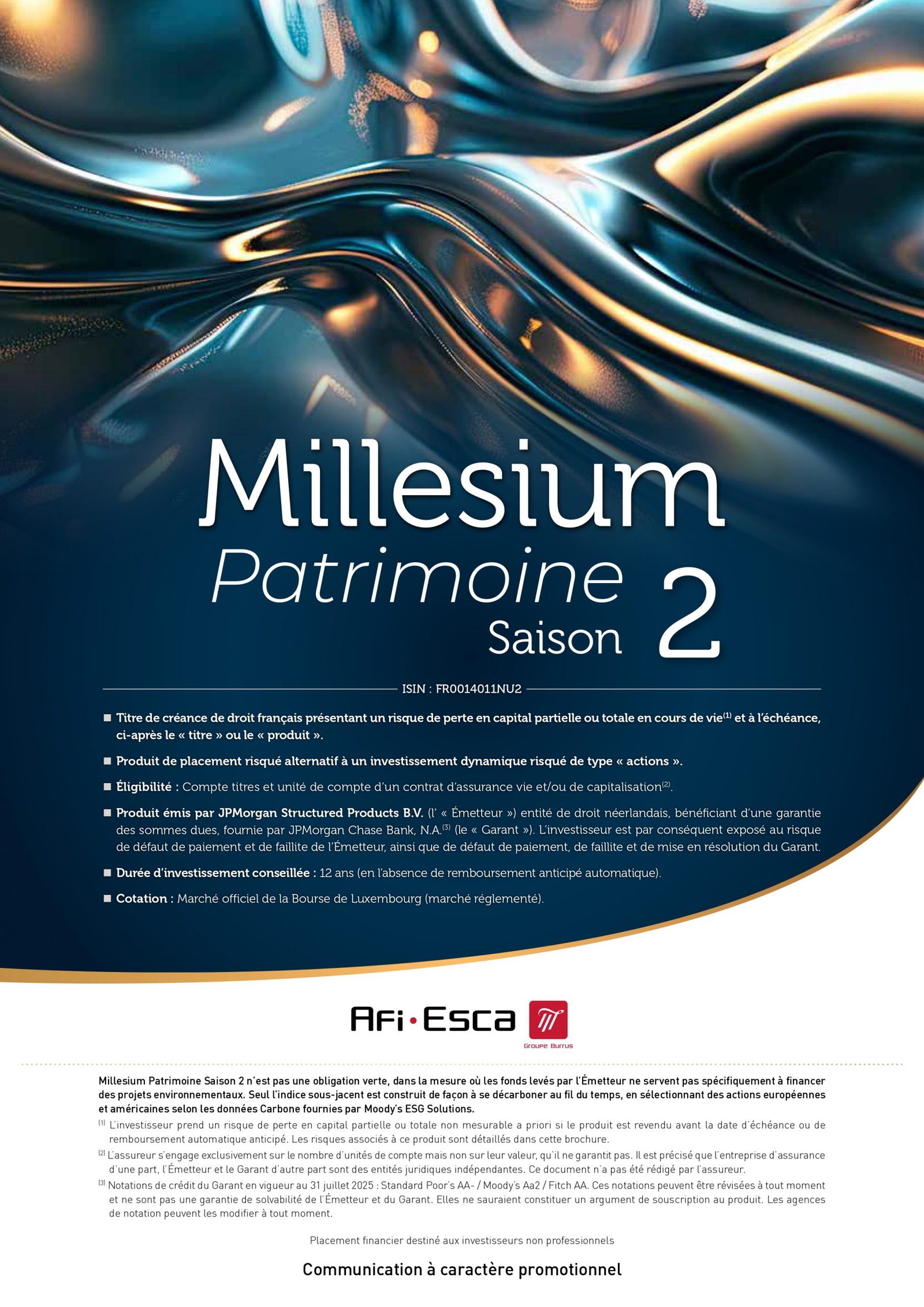 « Millesium Patrimoine Saison 2 » et « Millesium Dynamique Saison 2 » (ci-après les «Titres de créance ») sont des produits de placement risqués alternatifs à un investissement dynamique risqué de type « actions » éligibles au compte titres et unité de compte d’un contrat d’assurance vie et/ou de capitalisation. Ces produits présentent un risque de perte partielle ou totale en capital en cours de vie et à l’échéance. Les Titres de créance sont émis par JPMorgan Structured Products B.V. (l’ « Émetteur »), entité de droit néerlandais bénéficiant d’une garantie des sommes dues, fournie par JPMorgan Chase Bank, N.A. (le « Garant »). L’investisseur est par conséquent exposé au risque de défaut de paiement et de faillite de l’Émetteur, ainsi que de défaut de paiement, de faillite et de mise en résolution du Garant.